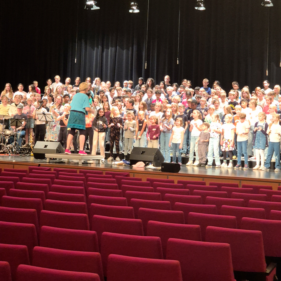 Am Freitagvormittag war dann die Generalprobe im Theater an der Blinke. Alle 220 Schüler*innen des 5. Jahrgangs von den verschiedenen weiterführenden Schulen standen zum ersten Mal gemeinsam auf der großen Bühne und wurden dabei auch von einer Band begleitet. Um 18 Uhr war es dann endlich soweit und alle Schüler*innen durften vor fast 700 Leuten im Publikum ein beeindruckendes einstündiges Abschlusskonzert präsentieren.
